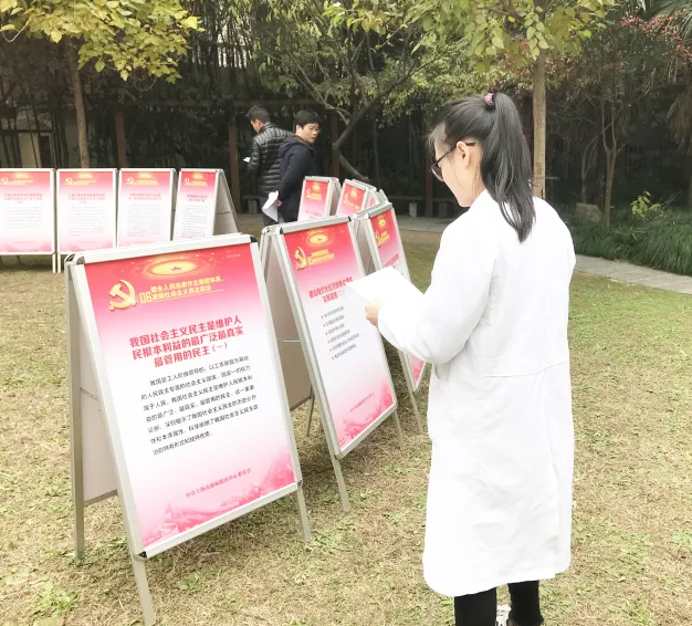 “一大早看到大草坪上放着这些展架就被吸引过来了。过来一看原来是密密麻麻的十九大知识,趁着提前到医院还没正式上班,我就在大草坪上伸伸腰呼吸一下新鲜空气顺便看看展板内容,一些之前没来得及领悟的十九大知识都看到了,很有收获。”中心保洁阿姨王女士如是说。