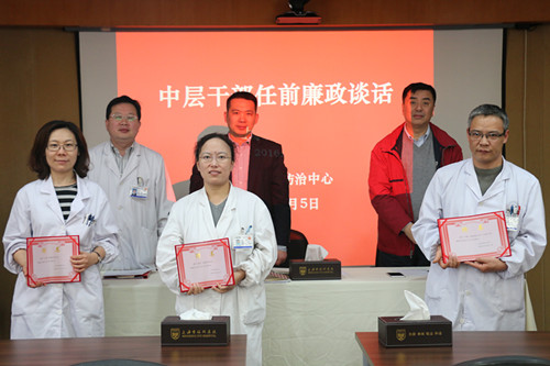 邹海东书记作了聘前干部谈话。要求中层干部要增强政治意识、大局意识、核心意识和看齐意识,要结合中心实际情况,深刻理解和实践。还结合上海市眼病防治中心科主任行为准则指出,要讲纪律,对纪律心存敬畏,做到坚决不碰“高压线”,杜绝商业贿赂和一切不合法不合规的医疗行为,筑牢底线,心底无私。
