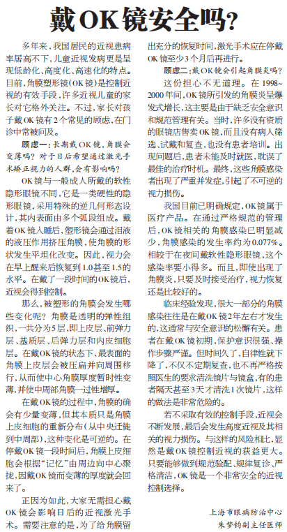 《上海大众卫生报》:戴OK镜安全么?