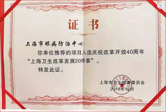 2018年12月,中心申报的“上海首创省级眼病防治融合体系,造福上亿民众”事件成功入选庆祝改革开放40周年“上海卫生改革发展20件事”。