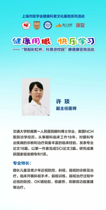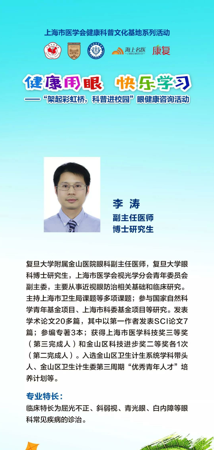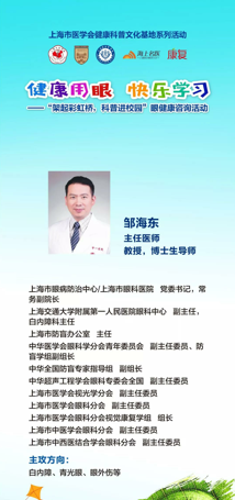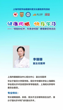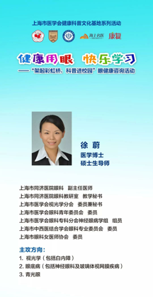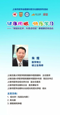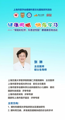 近年来,随着电子产品的不断普及,近视、视疲劳和干眼症等各类眼部问题呈现高发、低龄化趋势,青少年眼健康问题已严重影响其身心健康,引起了社会各界的广泛关注。为普及眼健康知识,增强在校大学生爱眼护眼意识,提高眼病防控能力,健康用眼,快乐学习,上海市医学会 | 上海市健康科普文化基地、上海市医学会视光学专科分会、上海市眼病防治中心、上海健康医学院、《海上名医》直播平台、《康复》杂志媒体平台拟联手开展主题为“健康用眼,快乐学习”的“架起彩虹桥,科普进校园”眼健康咨询活动。