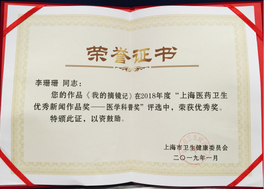 据悉,为进一步加大卫生健康新闻宣传工作力度,积极推进医药卫生医学科普宣传,为卫生健康事业发展营造良好舆论氛围,2018年底,上海市卫健委、上海市健康促进中心联合《大众卫生报》开展2018年度“上海医药卫生优秀新闻作品奖”(包括“医学科普奖”)评选活动。上海市眼病防治中心推选的新闻作品《全国首支爱眼歌发布》及《我的摘镜记》分别荣获“优秀新闻作品”及“优秀医学科普”奖。