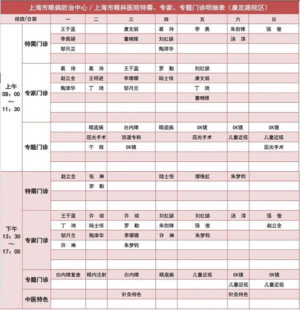 ✎ 起始日期:此排班表自5月6日起执行。康定院区诊室安排为:普通门诊、白内障、眼底病专题门诊在一楼普门、OK镜专题门诊在112,儿童近视、白内障复查专题门诊在117;其他专家门诊、特需门诊在二楼专家/特需(具体以当天实际诊室安排为准)。