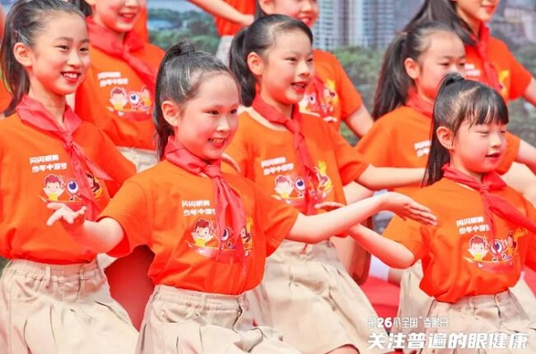 6月5日上午9:00,在全国“爱眼日”上海主题活动现场-美丽新虹桥中心花园,身着橙色衫的上海棋院小学16位少年,沐浴在明媚的阳光下,唱响《明眸闪亮 少年中国梦》护眼主题歌,愿它能够在儿童青少年的心中种下“明眸”意识,养成有益一生的健康习惯,陪伴他们幸福快乐茁壮成长。