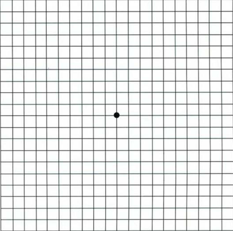 当凝视中心黑点时,发现方格表中心区或其它区域的黑线出现弯曲、断裂或变形,或者方格部分位置出现模糊或空缺,就可能是眼底黄斑区出现病变,应尽快至眼科医院进行就诊。