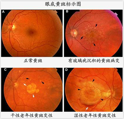 老年性黄斑变性分为干性和湿性两种。干性是指黄斑区视网膜有黄白色斑点,称为玻璃疣,对视力影响不大,有时多年无变化。湿性黄斑变性则是色素上皮层下有活跃的新生血管,从而引起一系列渗出、出血、瘢痕改变,往往对引起的严重的视力下降、视物变形或中央暗点,进展迅速。