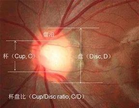 一般来说,根据颞侧(图中右侧)中小型血管的方向改变来判断视杯的外沿。杯盘比,即视杯的直径/视盘的直径,简称C/D,正常约为0.3-0.4,≥0.5算大视杯。