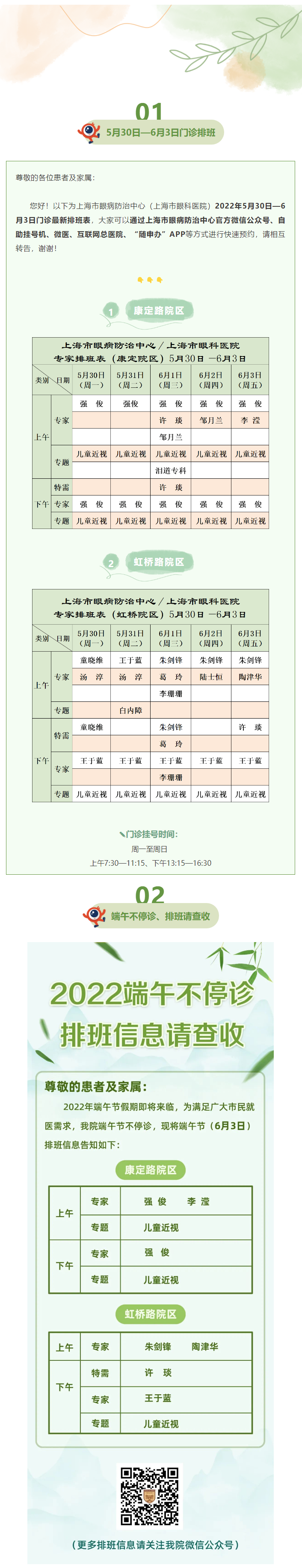 门诊最新排班(5月30日-6月3日),眼防端午不停诊噢!
