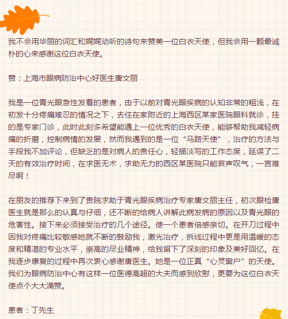 8月10日,患者丁先生发来肺腑感谢信感谢唐文丽医生。感谢信内容如下(原话,未改动):