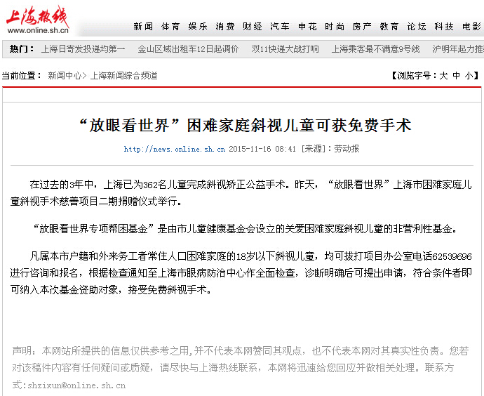 《上海热线》“放眼看世界”困难家庭斜视儿童可获免费手术