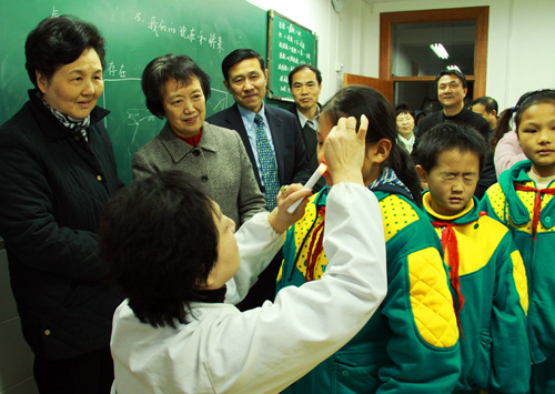 市慈善基金会副理事长金闽珠、周剑萍视察农民工子弟小学沙眼排查