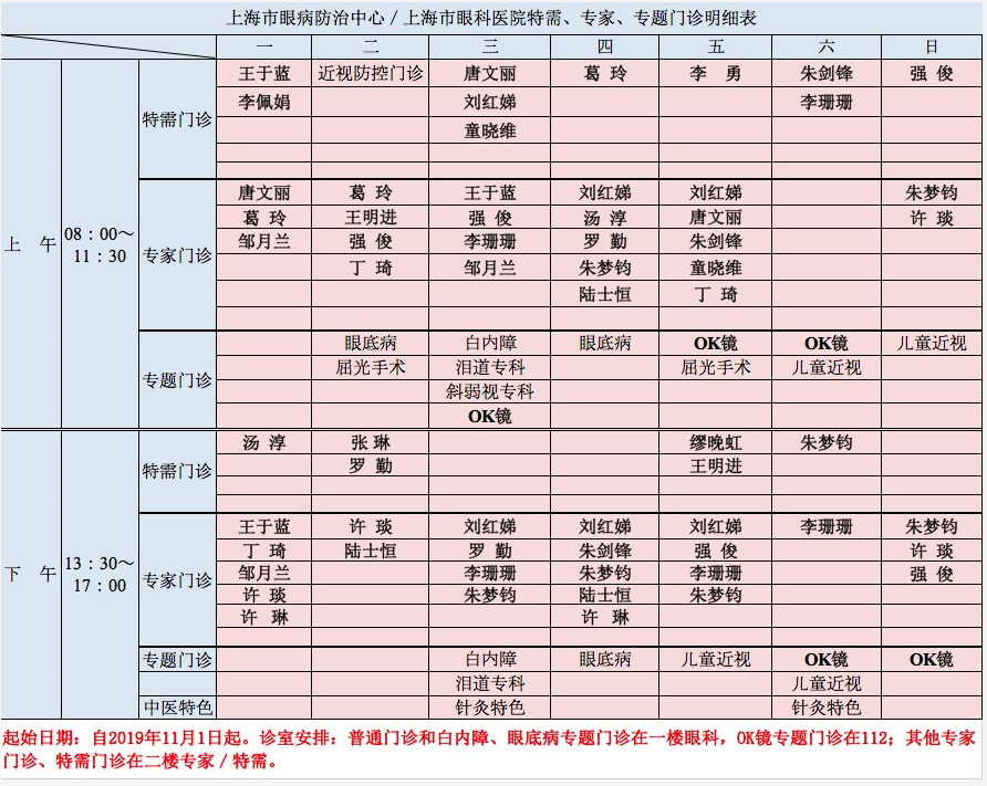 您好!以下为上海市眼病防治中心(上海市眼科医院)2019年11月门诊排班表,请相互转告,谢谢!