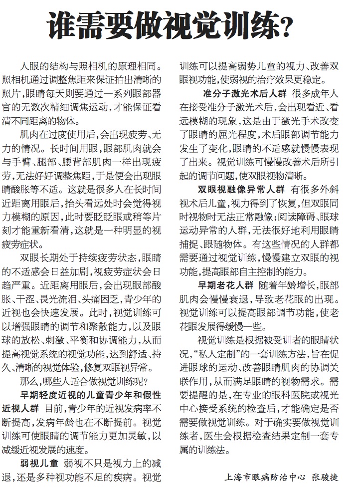 《上海大众卫生报》:谁需要做视觉训练