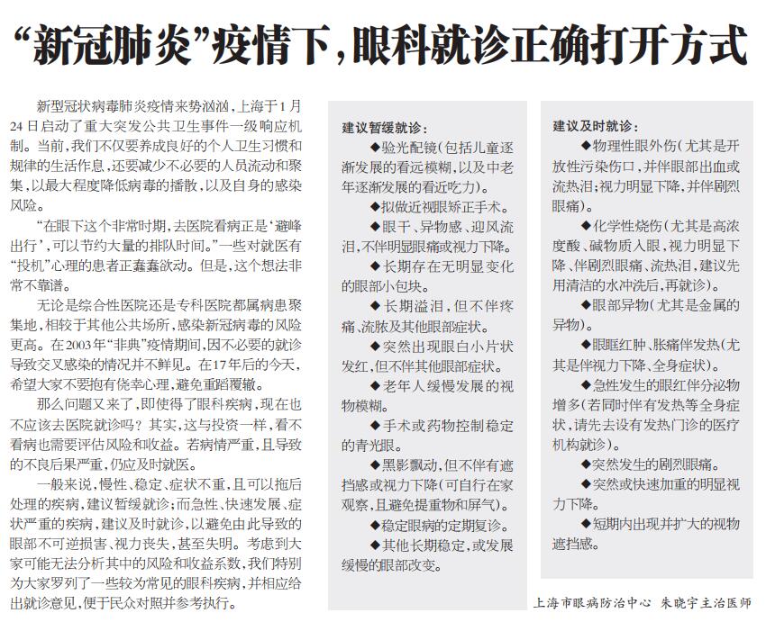 《上海大众卫生报》:“新冠肺炎”疫情下,眼科就诊正确打开方式