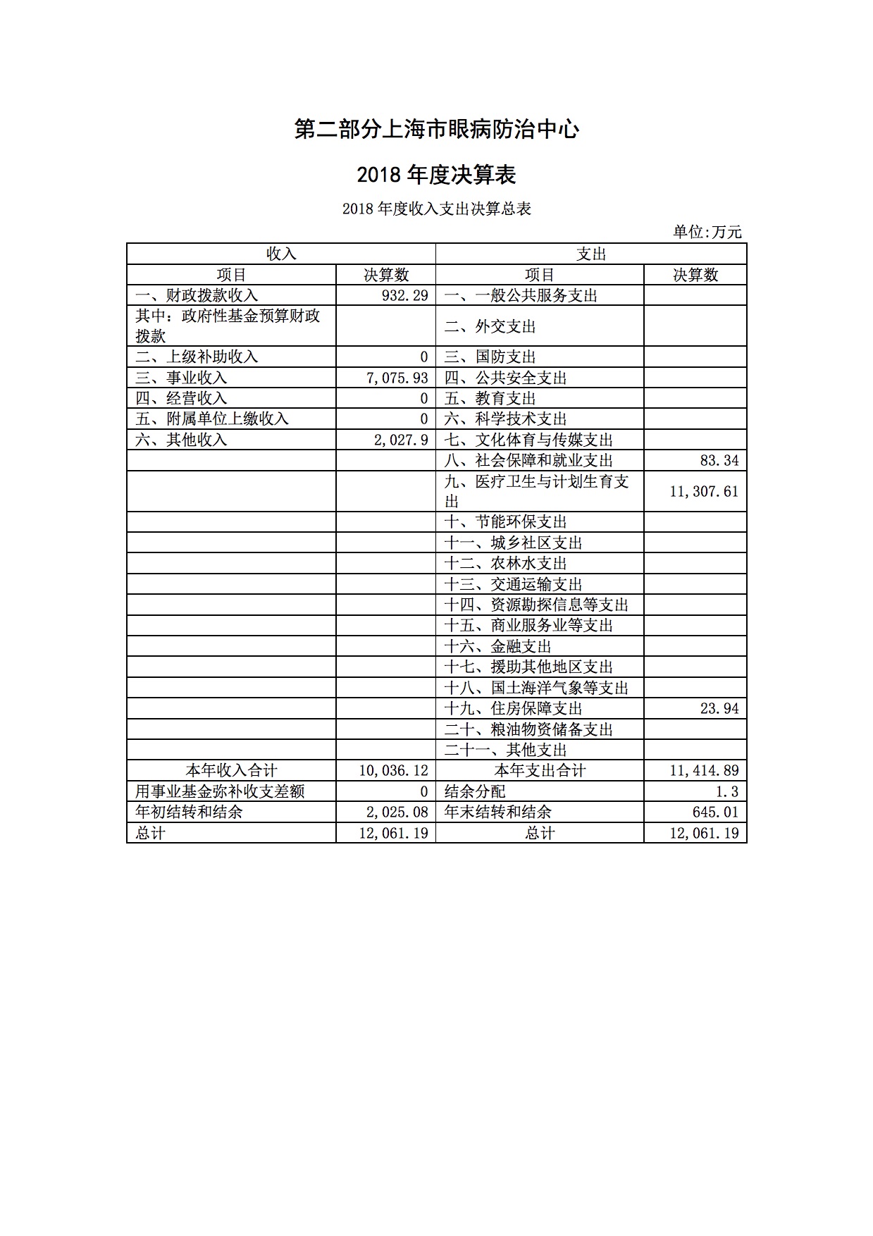 一、关于上海市眼病防治中心2018年度收入支出决算总体情况说明