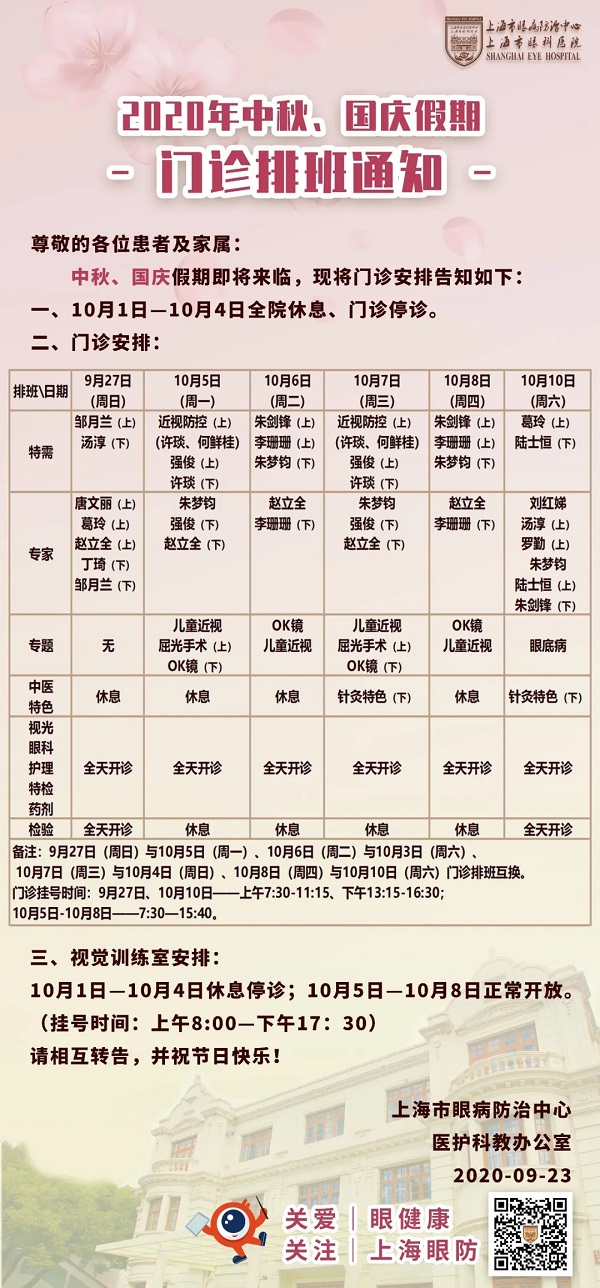 您好!以下为上海市眼病防治中心(上海市眼科医院)2020年中秋、国庆假期门诊排班通知,请相互转告,谢谢!