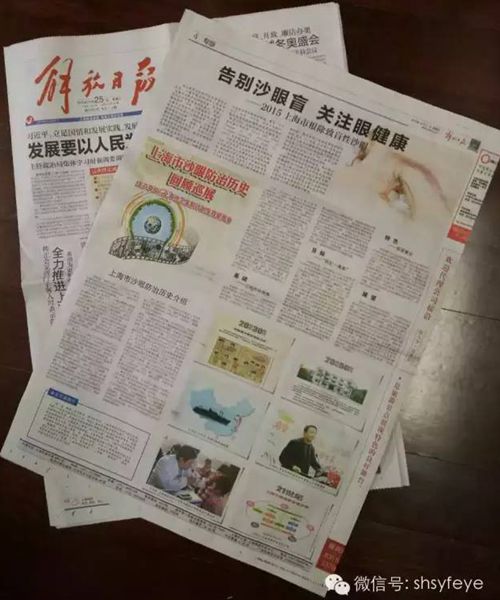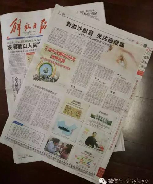 12月11日,《解放日报》第4版专版推出了告别沙眼盲,关注眼健康——2015年上海市根除致盲性沙眼的整版文章,文章介绍了上海市沙眼防治的历史等等情况。