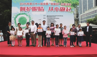 随后,由市眼病防治中心联合市科教举办的“呵护眼睛 ‘目’浴阳光”上海市儿童创意绘画大赛颁奖仪式开始。国家卫计委医政医管局副巡视员段勇、国家教育部体卫艺司巡视员廖文科、市卫计委副主任章雄、市教委副主任王平等颁发了最佳创意、最佳构图及最佳主题奖,并和获奖小朋友们合影留念