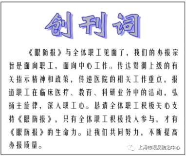 导读:也许,你听说过很多报,研读过很多报,但却没见过一种报,它是外界了解上海市眼病防治中心的重要窗口和平台,是反映上海市眼病防治中心发展风貌的浓缩。随着国家新医改的不断推进,它作为上海市眼病防治中心宣传的重要渠道已成为中心发展必不可少的重要一环。同时,在上海市眼病防治中心文化的培育和建设中,从它身上也可以窥探出中心的核心精神,观察到中心蓬勃的生命力,及感受到中心强大的员工凝聚力。它叫《眼防报》。