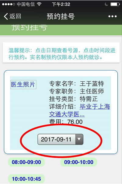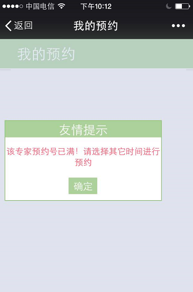 如所选医生没有号源时,会提示“该专家预约号已满”信息,这时您可以重新约其他时间或选其他医生。