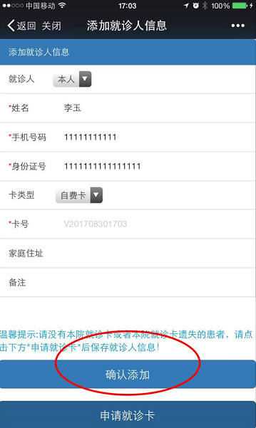 4、卡号即是点击下方“申请就诊卡”自动生成,最后点击“确认添加”即可。