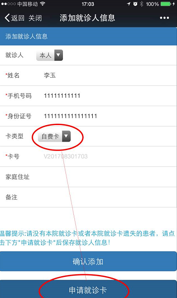 选择“自费卡”则需点击下方“申请就诊卡”自动生成卡号