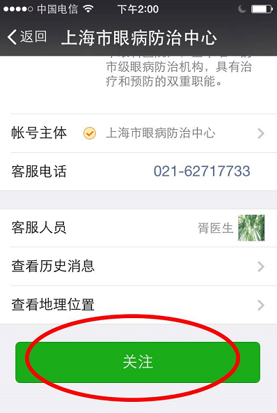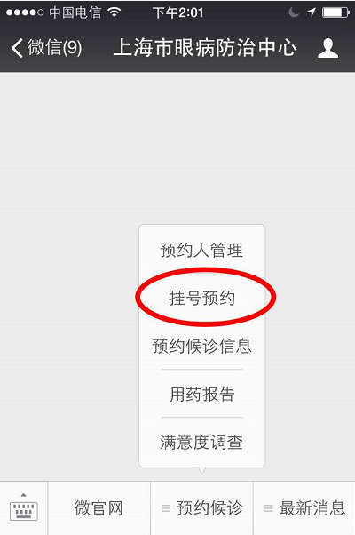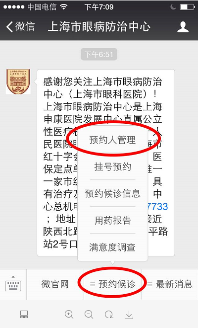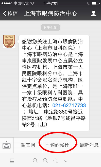 第一步:关注微信公众号。用微信预约当然先得关注公众号。关注“上海市眼病防治中心”官方微信公众号途径主要有3种:1、连接医院WIFI自动关注;2、直接搜索“上海市眼病防治中心”公众号进行关注;3、通过扫一扫二维码加以关注。总之成功关注公众号是进行微信预约挂号的前提。